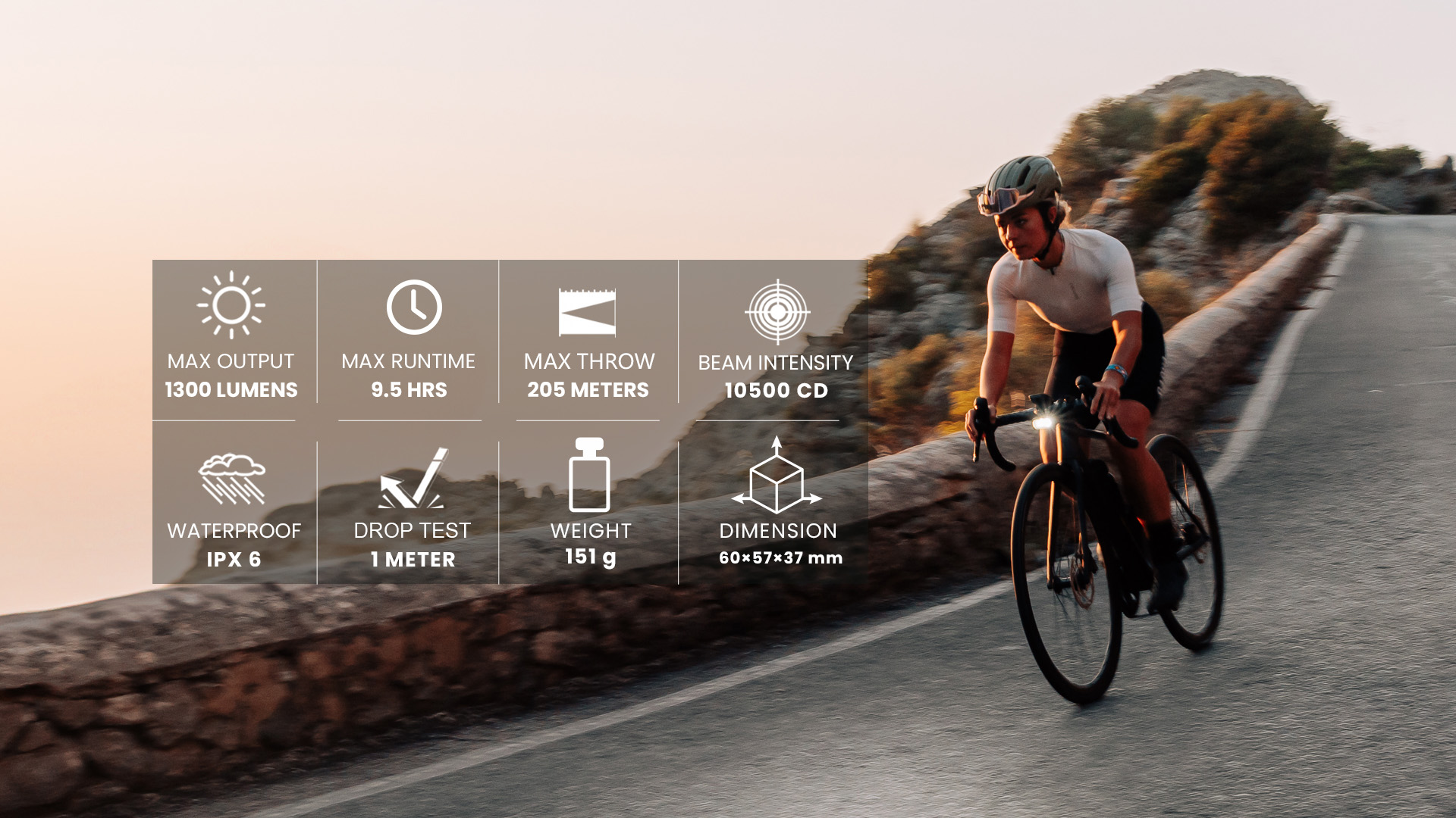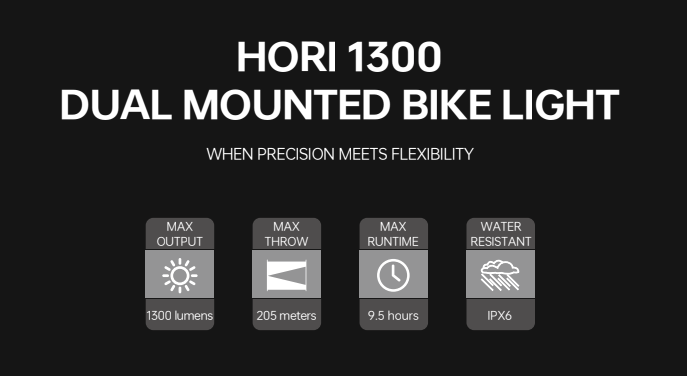 Prepárate para un auténtico versátil todo en uno. La HORI 1300 se presenta en una forma horizontal elegante, entregando 1300 lúmenes potentes. Está diseñada para el ciclista moderno, con rendimiento, control y un diseño amigable con el cockpit en su núcleo.
