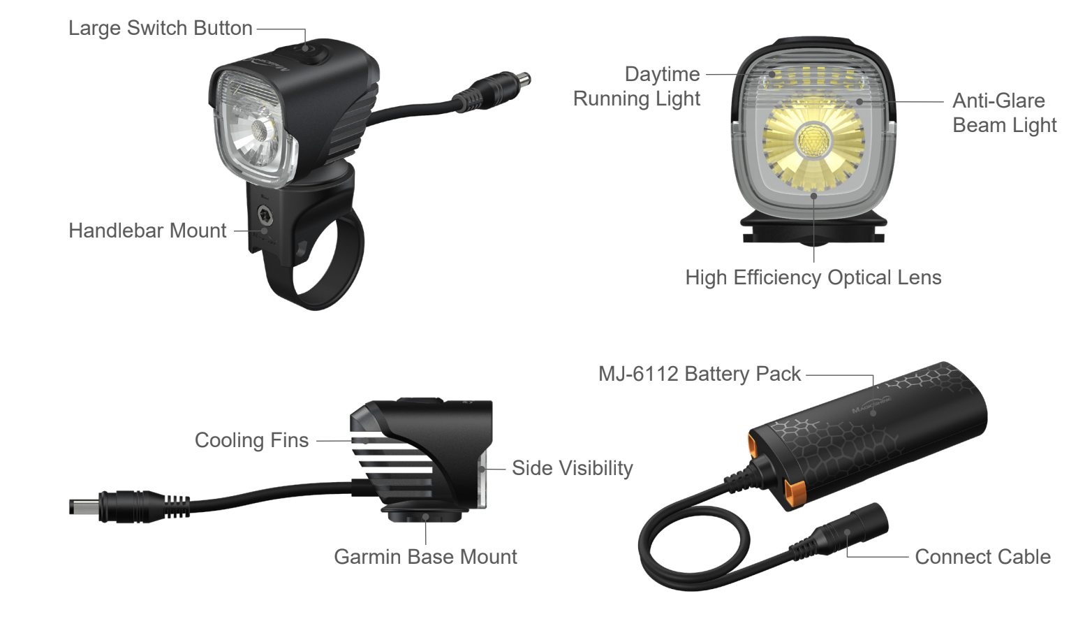 Junto con la luz está nuestro paquete de baterías de diseño personalizado MJ-6112. No sólo tiene un aspecto mucho más fresco que la unidad original, Magicshine MJ-900S es ahora recargable por USB y un banco de energía móvil de respaldo. El indicador de la capacidad de la batería es ahora visible tanto en el interruptor de encendido de la luz como en el paquete de baterías.