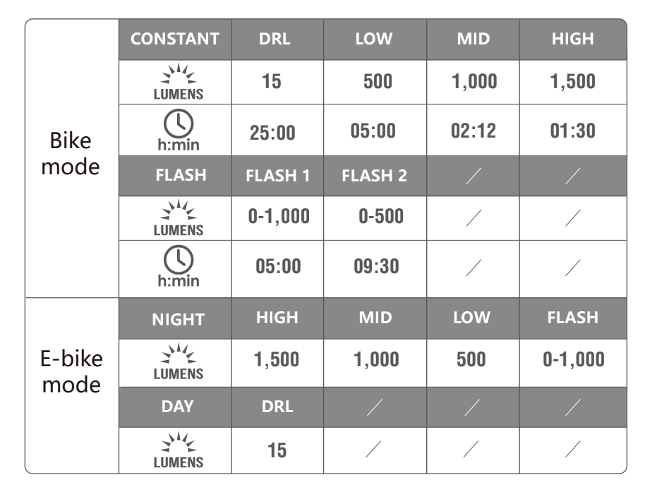• Modos de brillo de 1500/1000/500 lúmenes, 2 modos de flash y modo DRL independiente.