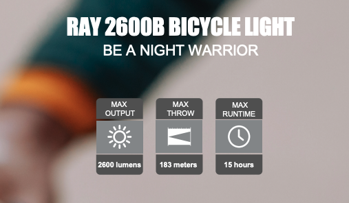La nueva RAY 2600B es una potente luz para bicicleta con una configuración de doble LED que emite suficiente luz con 2600 lúmenes, adecuada para ciclismo de montaña, cruce de senderos, ciclismo en carretera y desplazamientos diarios. Equipado con un sistema de doble lente óptico, la RAY 2600B proporciona iluminación cercana y de largo alcance, haciendo que las señales de tráfico o las ramas colgantes sean más visibles y permitiendo navegar desde las calles de la ciudad hasta terrenos desafiantes.
