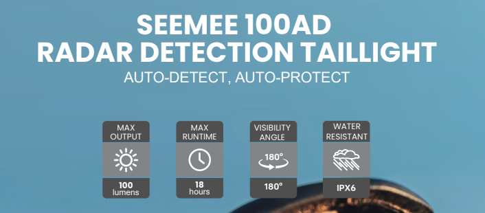 Aprovechando capacidades de detección por radar de última generación, el SEEMEE 100AD permanece vigilante, capaz de detectar vehículos que se acercan desde hasta 25 metros de distancia. Ya sea el paso silencioso de bicicletas eléctricas o el movimiento rápido de autos que viajan a velocidades entre 5 y 160 kilómetros por hora, el SEEMEE 100AD responde rápidamente y alerta con un destello de 100 lumens, reduciendo efectivamente las probabilidades de accidentes por alcance y asegurando un viaje más seguro.