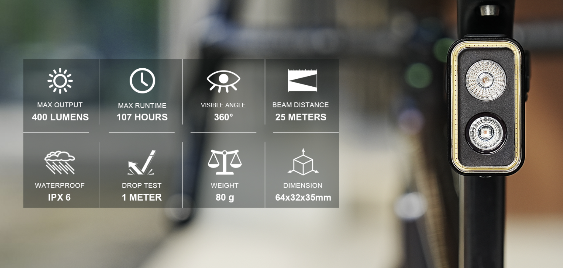 La SEEMEE 400 ofrece hasta 107 horas de autonomía, carga rápida por USB-C y una función de bloqueo para evitar encendidos accidentales. Su clasificación de impermeabilidad IPX6 garantiza fiabilidad en cualquier clima, mientras que el soporte de un cuarto de vuelta ofrece una instalación rápida y segura en tijas o raíles de sillín.