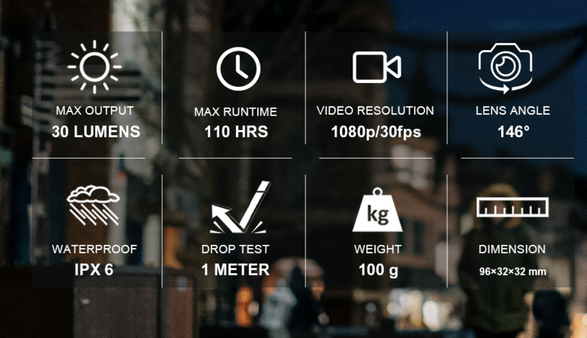 Operación y Carga: En la parte superior hay dos interruptores fáciles de usar: uno para la luz trasera y otro para la grabación de la cámara. Alimentado por una batería de 3400mAh con un puerto de carga USB-C, puedes ajustar la configuración de la cámara y la luz trasera para maximizar la duración de la batería.