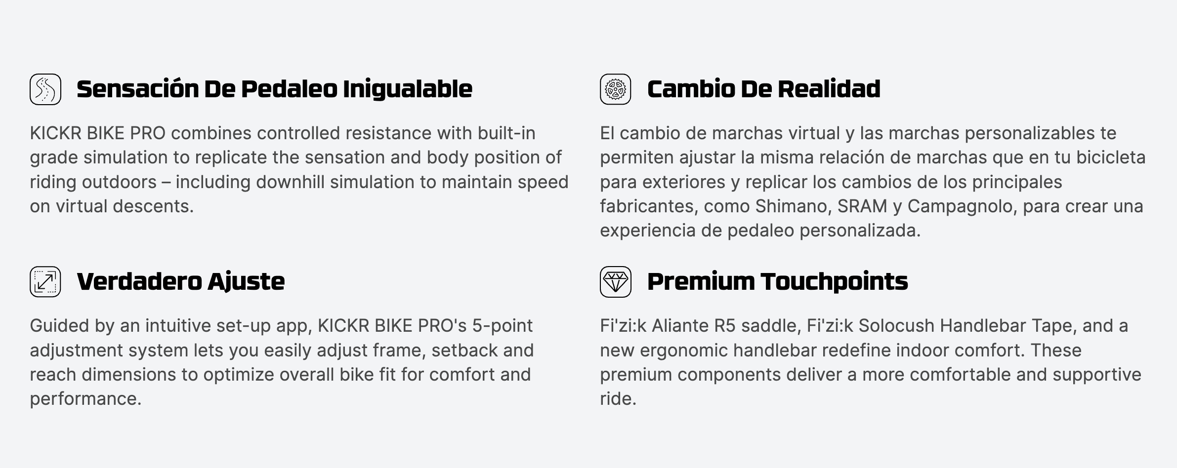 La KICKR BIKE PRO redefine el ciclismo indoor. Con controles de cambio de última generación, puntos de contacto premium y un realismo de conducción inigualable, ofrece la experiencia de entrenamiento indoor más inmersiva hasta la fecha. Diseñada para ciclistas que exigen el máximo rendimiento y control total, esta es la evolución del ciclismo indoor.